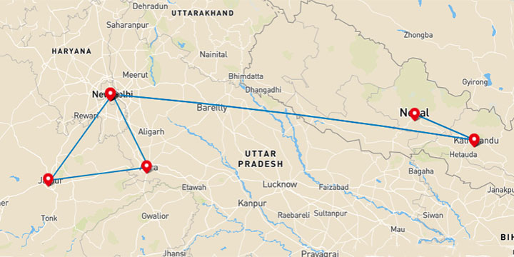 Delhi, Agra, Jaipur, Delhi, Kathmandu, Pokhara