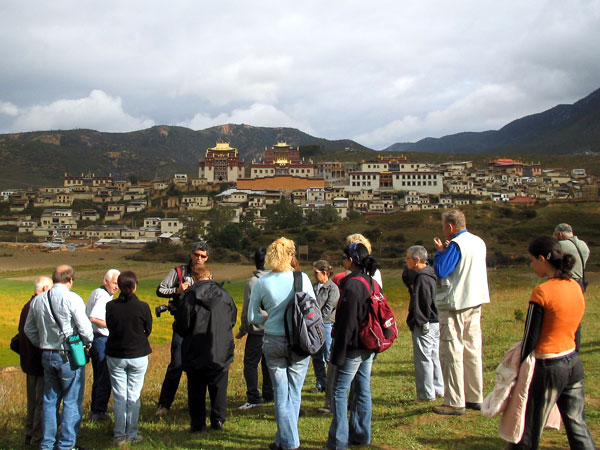 After traversing the mountain ranges, you will make a short stop and have lunch at Benzilan town, where you will be astonished by the Moon Bend of Jinsha(Yangtze) River, Dongzhulin monastery and Baima (white horse) Snow Mountain. The view along the way is fantastic with different kinds of trees, streams down the valley, prayer flags and stupas, and Tibetan villages.